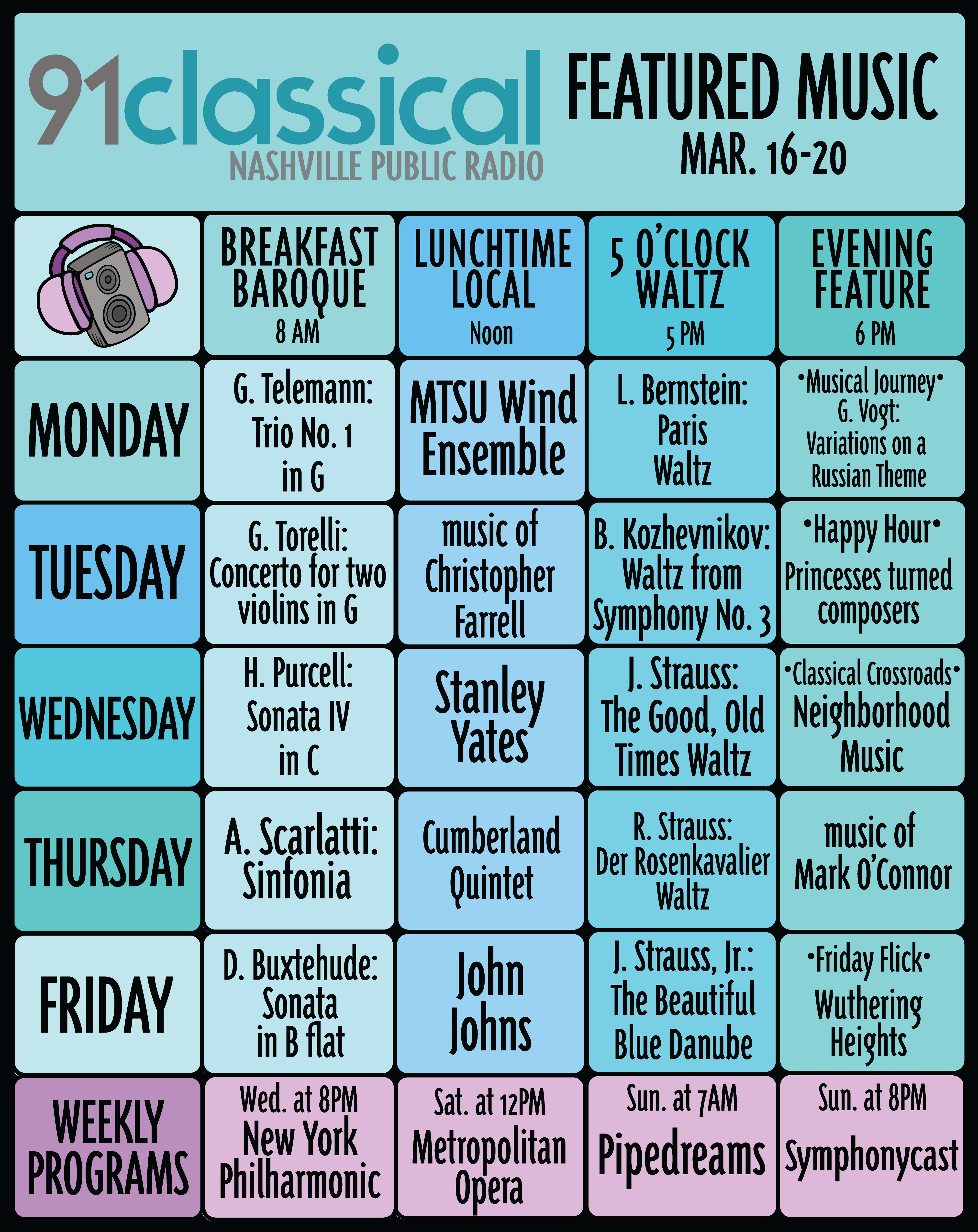 Each day on 91Classical, amid the variety of the day’s playlist, we offer a handful of featured selections at set times: