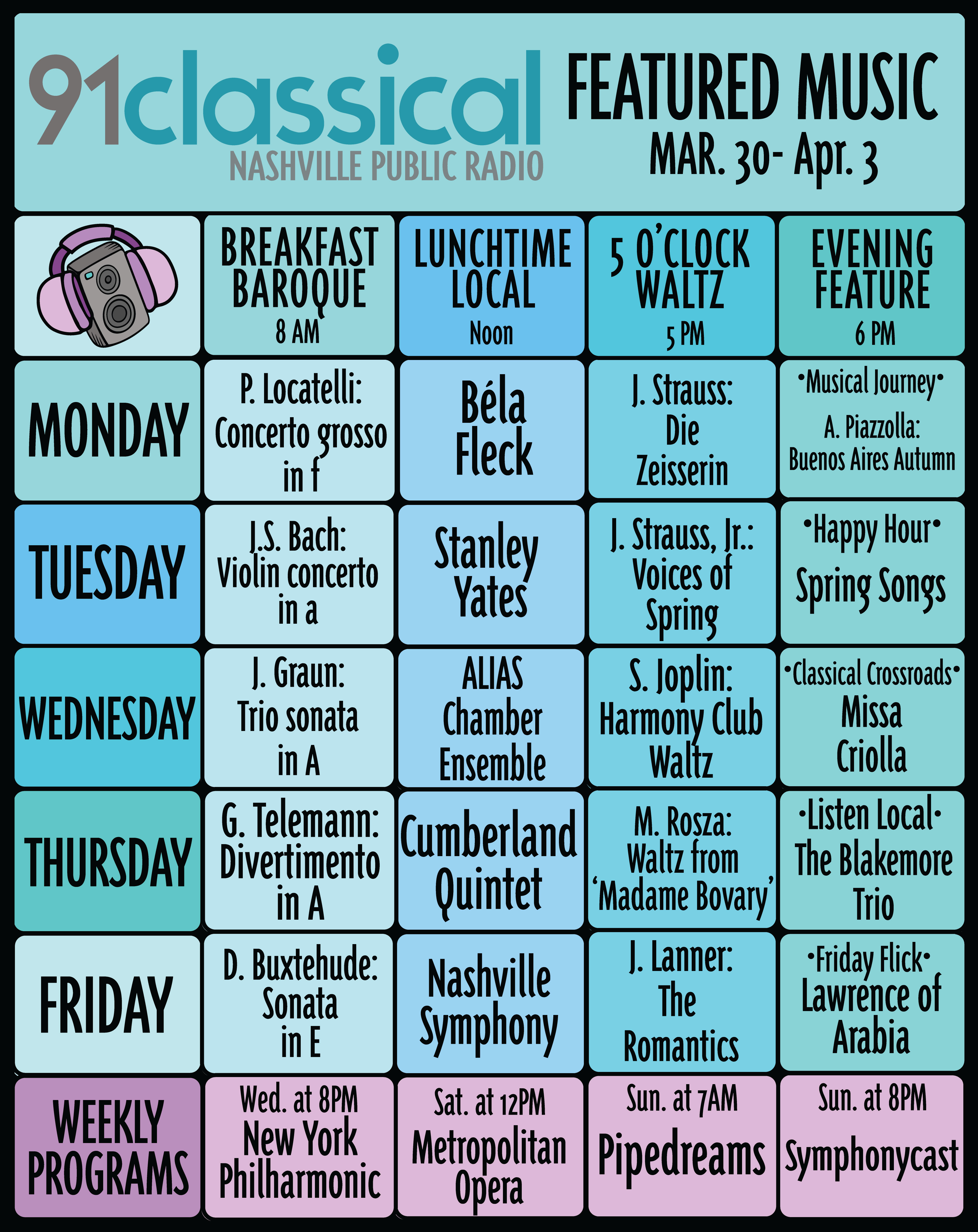 Each day on 91Classical, amid the variety of the day’s playlist, we offer a handful of featured selections at set times: